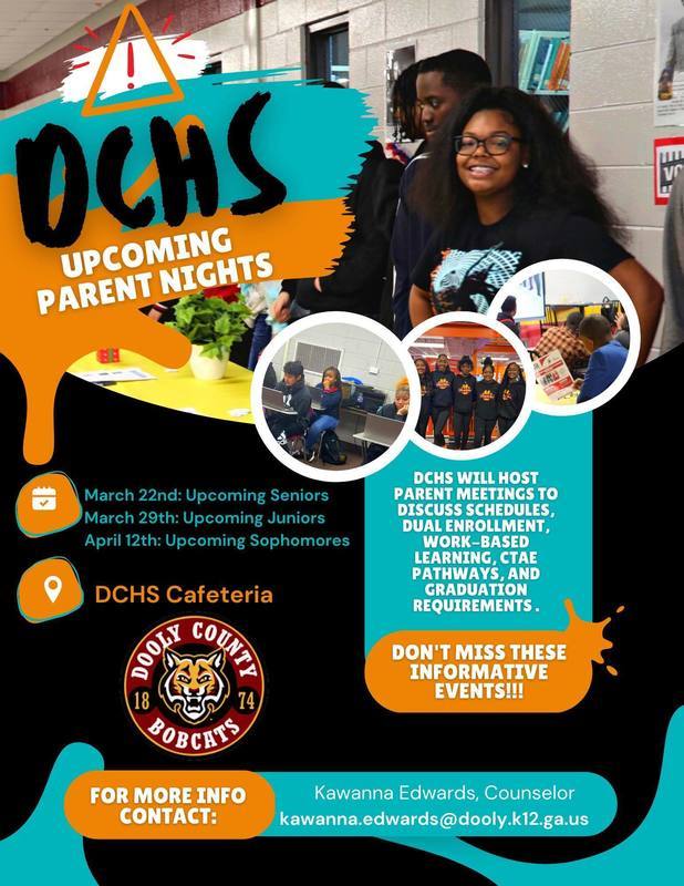 Dooly County High School is hosting “Parent Night” on the upcoming dates to discuss student schedules, dual enrollment, CTAE, and more. Please see the flyer below for more details.