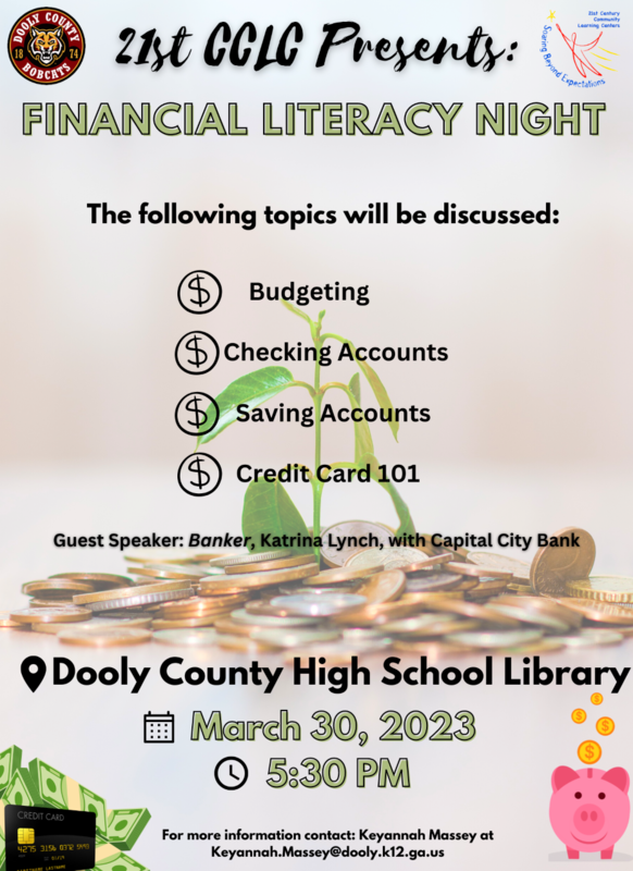 The Dooly County 21st CCLC will be hosting another Financial Literacy Night on this Thursday, March 30th, at 5:30 PM. The event will be held in the library at Dooly County High School. We hope to see you there!