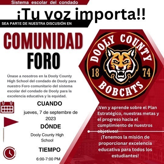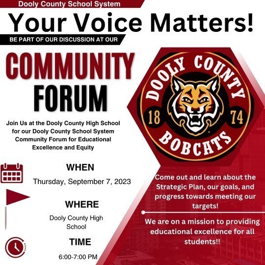 Please come out and join us at the Dooly County High School on September 7, at 6 p.m. for the Dooly County School System’s Community Forum for Educational Excellence and Equity. The purpose of the forum is for you to hear and learn about our strategic plan, our goals, and our progress towards meeting our targets thus far. We also want to hear your voice as we update the plan for the 23-24 school year. We are on a mission and your voice is needed. See you there!!!