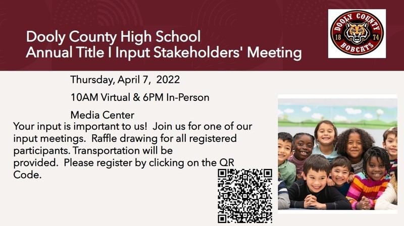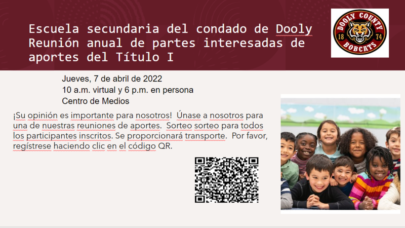 Usted está invitado a la Reunión Anual de Partes Interesadas del Título I de la Escuela Secundaria del Condado de Dooly el jueves 7 de abril. Habrá una reunión virtual y presencial. Regístrese haciendo clic en el código QR de arriba. Haga clic aquí para ver el folleto.