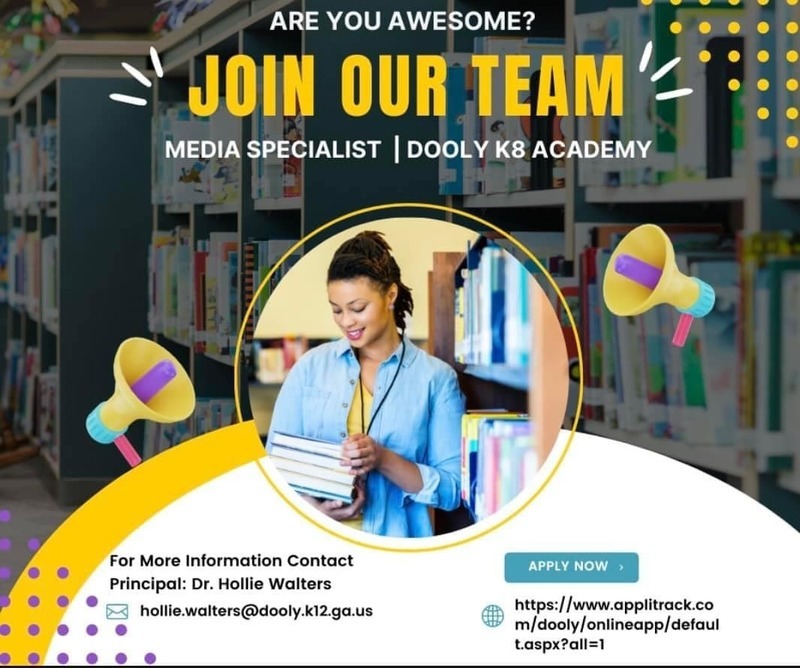The Dooly County K-8 Academy is looking for a Media Specialist. If interested, please see information below on how to on apply. #AchievingExcellenceTogether