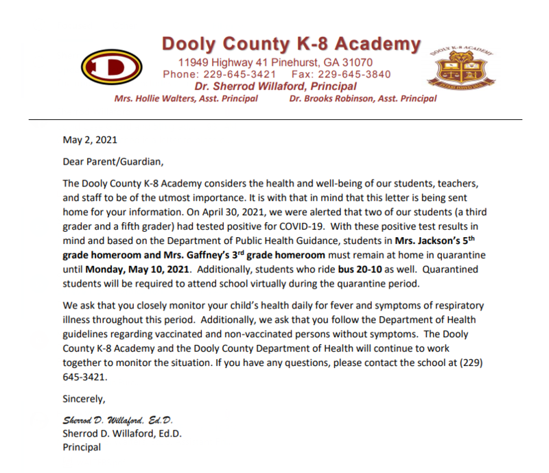 Quarantine Notice for Bus 20-10, Ms. Jackson's Homeroom and Ms. Gaffney's Homeroom