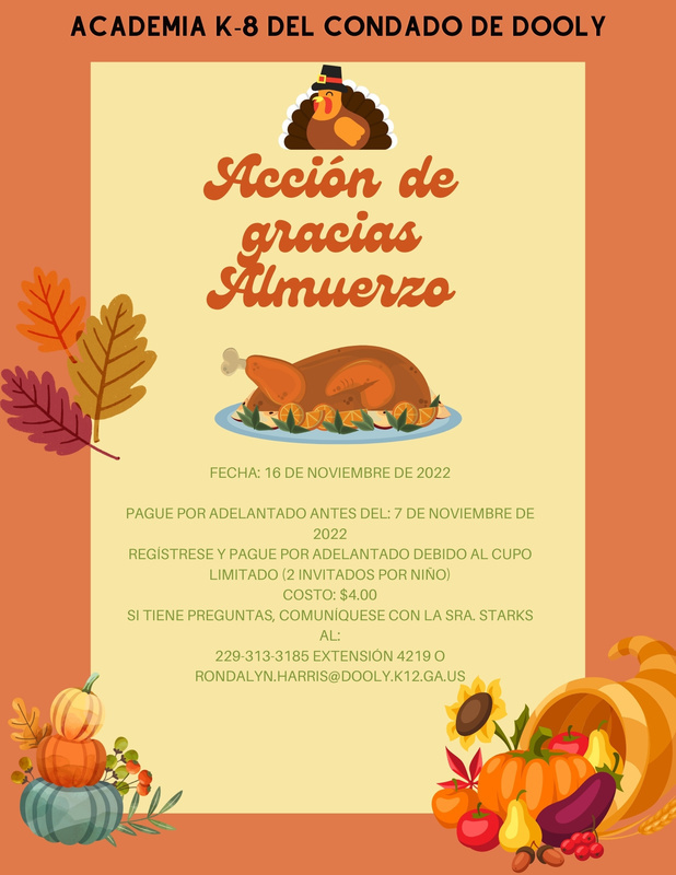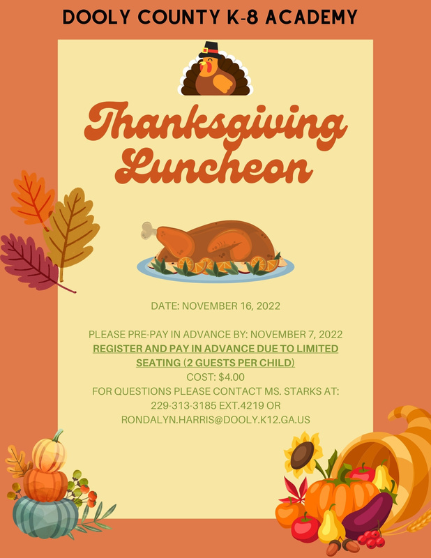 The Dooly K8 Academy will have its Thanksgiving Luncheon on Wednesday, November 16, 2022. If you plan on attending, details are on this flyer (detailed forms were also sent home last week with our scholars). Please register ASAP. Thank you, and we hope to see you there!